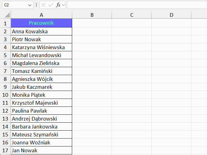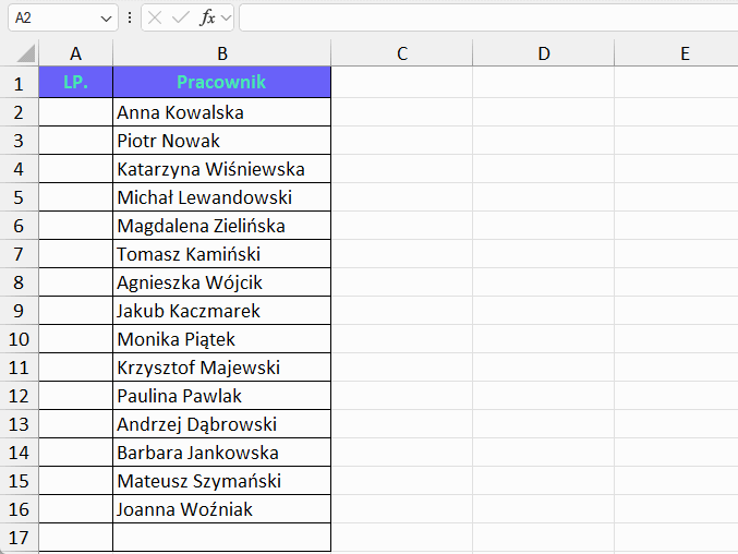 Excel wygeneruje numerację odpowiadającą liczbie wpisanych osób. Jeśli lista się skróci lub wydłuży, numeracja automatycznie się dostosuje.