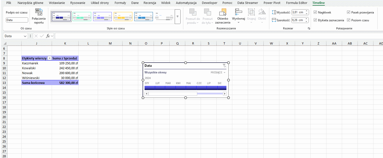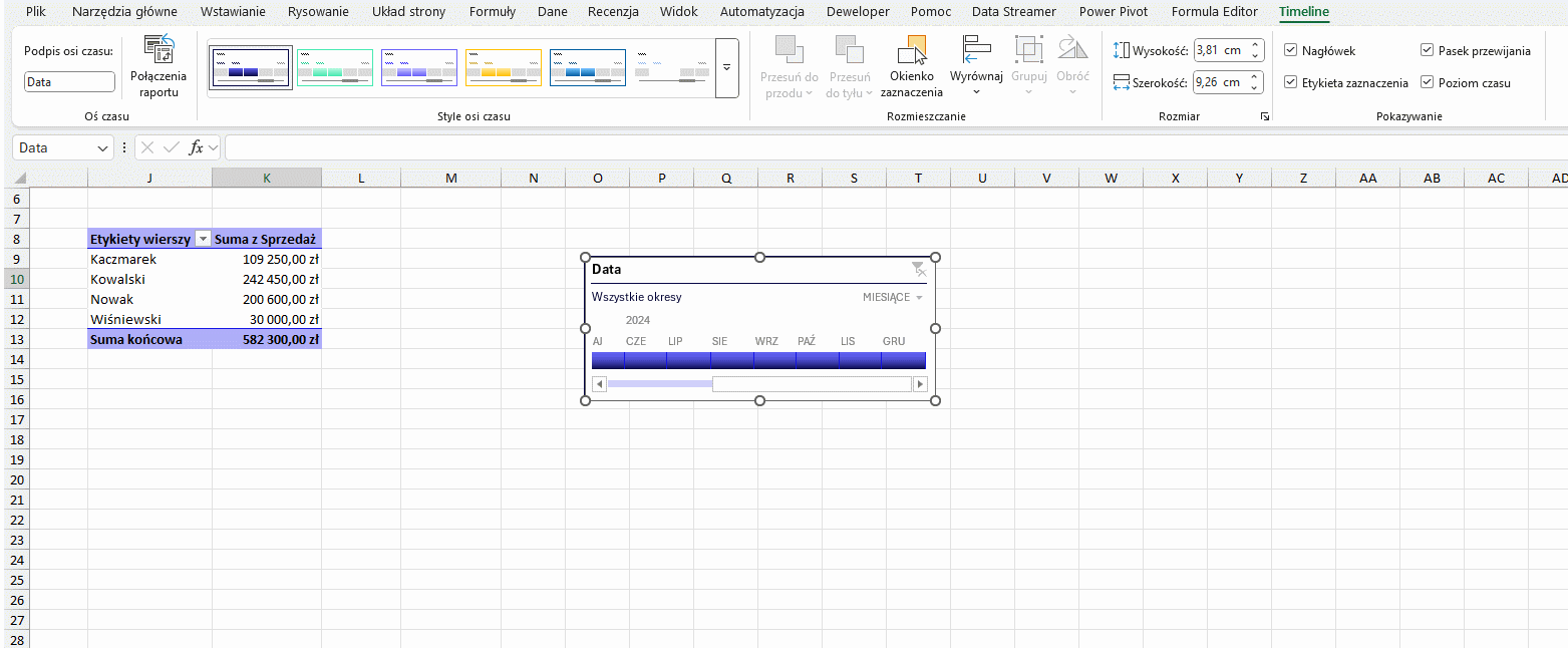 Właśnie dlatego oś czasu tak dobrze sprawdza się w raportach zarządczych i prezentacjach. Ułatwia rozmowę o danych, skraca dystans między pytaniem a odpowiedzią i pozwala skupić się na decyzjach, a nie na obsłudze Excela.