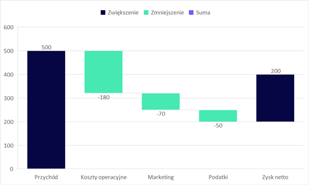 Wykres kaskadowy pozwala prześledzić, krok po kroku, jak zmienia się wynik końcowy. Pokazuje, które wartości go zwiększają, a które obniżają, dzięki czemu łatwo zrozumieć, skąd bierze się finalny rezultat.