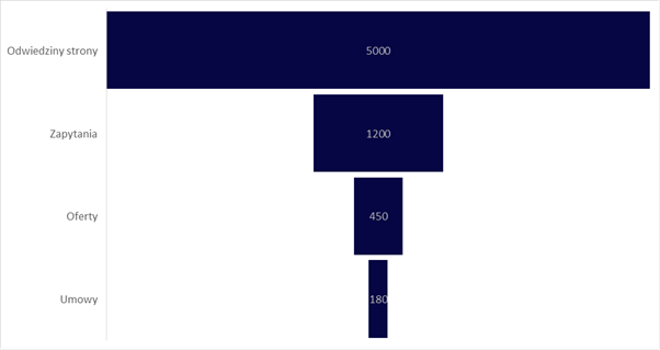 Wykres lejkowy dobrze sprawdza się wtedy, gdy chcesz pokazać proces, w którym z każdym kolejnym krokiem „ubywa” elementów. Na pierwszy rzut oka widać, gdzie liczba osób, klientów lub zadań wyraźnie się zmniejsza i na którym etapie następuje największy spadek.
