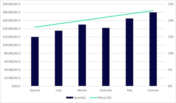 Zastosowanie: jednoczesna prezentacja wartości i trendu, sprzedaż i marża.