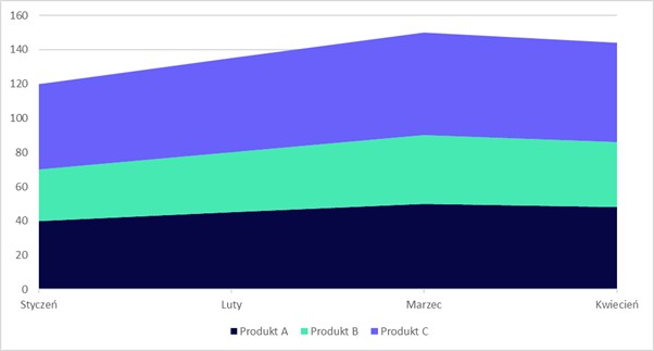 Wykres warstwowy pokazuje zmiany wartości w czasie, jednocześnie prezentując udział poszczególnych kategorii w całości. Obszary na wykresie są „nakładane” jeden na drugi, tworząc skumulowany obraz danych.