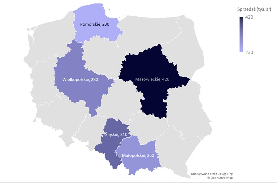 Zastosowanie: sprzedaż według regionów, porównanie wyników województw, analizy geograficzne.